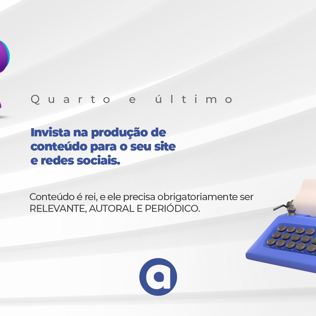 Invista na produção de conteúdo para o seu site e redes sociais. Conteúdo é rei, e ele precisa obrigatoriamente ser RELEVANTE, AUTORAL E PERIÓDICO.